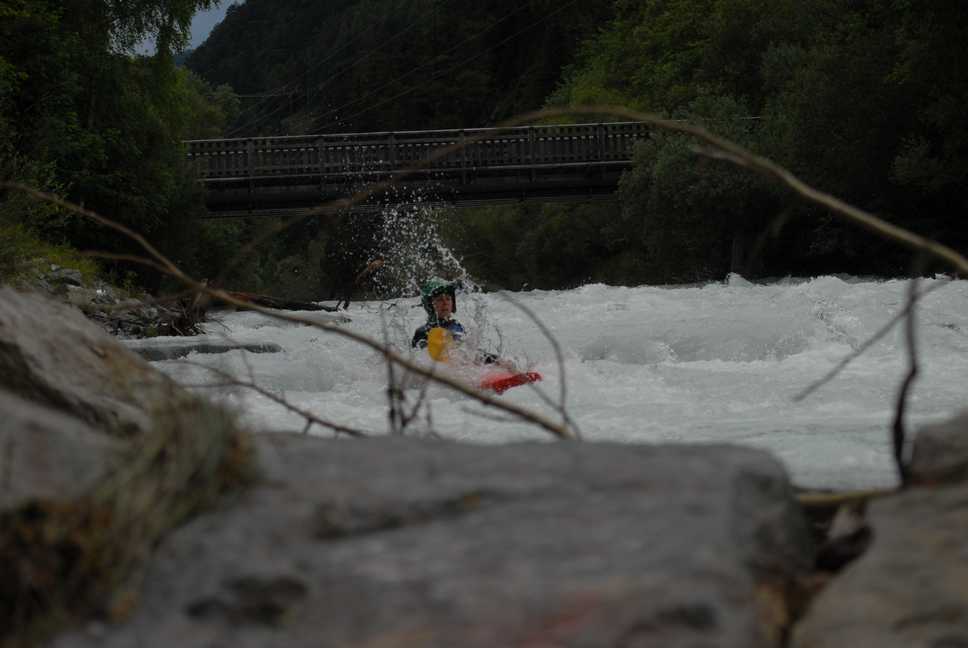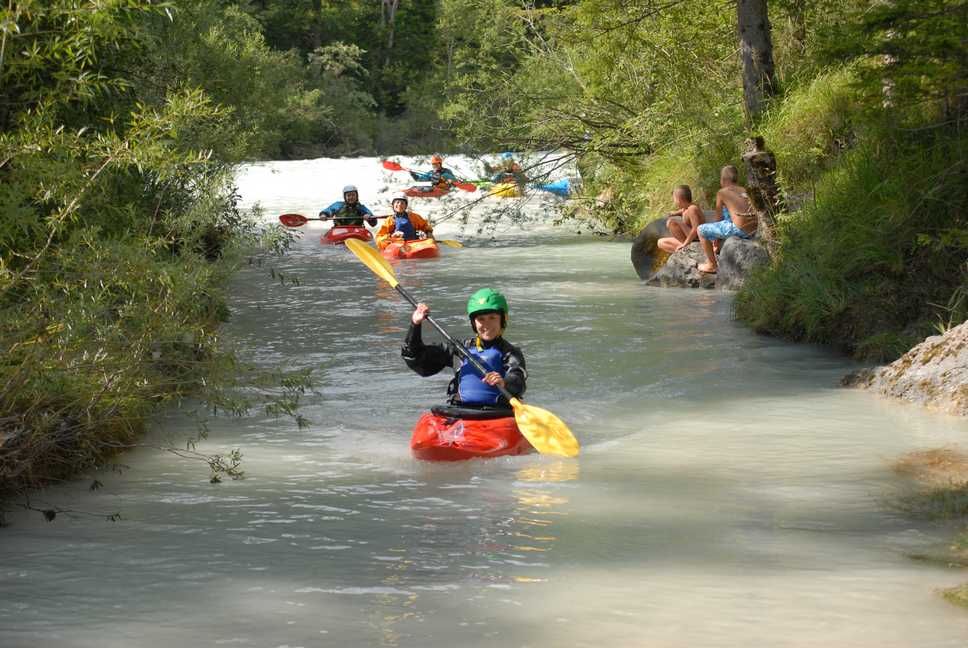 Beim großen Parkplatz in Scharnitz auf der linken Flussseite gibt es gleich unterhalb des Blockwurfwehres eine gute Einstiegsmöglichkeit. Nach ca. 300 m direkt unterhalb der Brücke kommt die erste kurze Schwallstrecke. In diesem Bereich ist die Isar teilweise kanalisiert und bietet wenige Anlandemöglichkeiten. Schon bald nach der Brücke kommt die nächste Schwallstrecke mit einem Baum auf der rechten Uferseite und etwas unterhalb mit Holz am linken Ufer. Dannach geht es wesentlich einfacher weiter (WW I) und die Isar verzweigt sich oft in mehrere Arme. Beim Fussballplatz auf der linken Uferseite kommen zwei kleine Stufen (WW II - III). Ein wenig weiter verläuft die Isar dann entlang der Strasse und ist meist kanalisiert. Dennoch bietet sie auch hier noch abwechslungsreiches Wildwasser mit vielen Surfwellen und Spielstellen. Nach dem Militärgelände auf der rechten Uferseite erreicht man bald die erste Strassenbrücke und schon bald danach den Campingplatz Isarhorn.