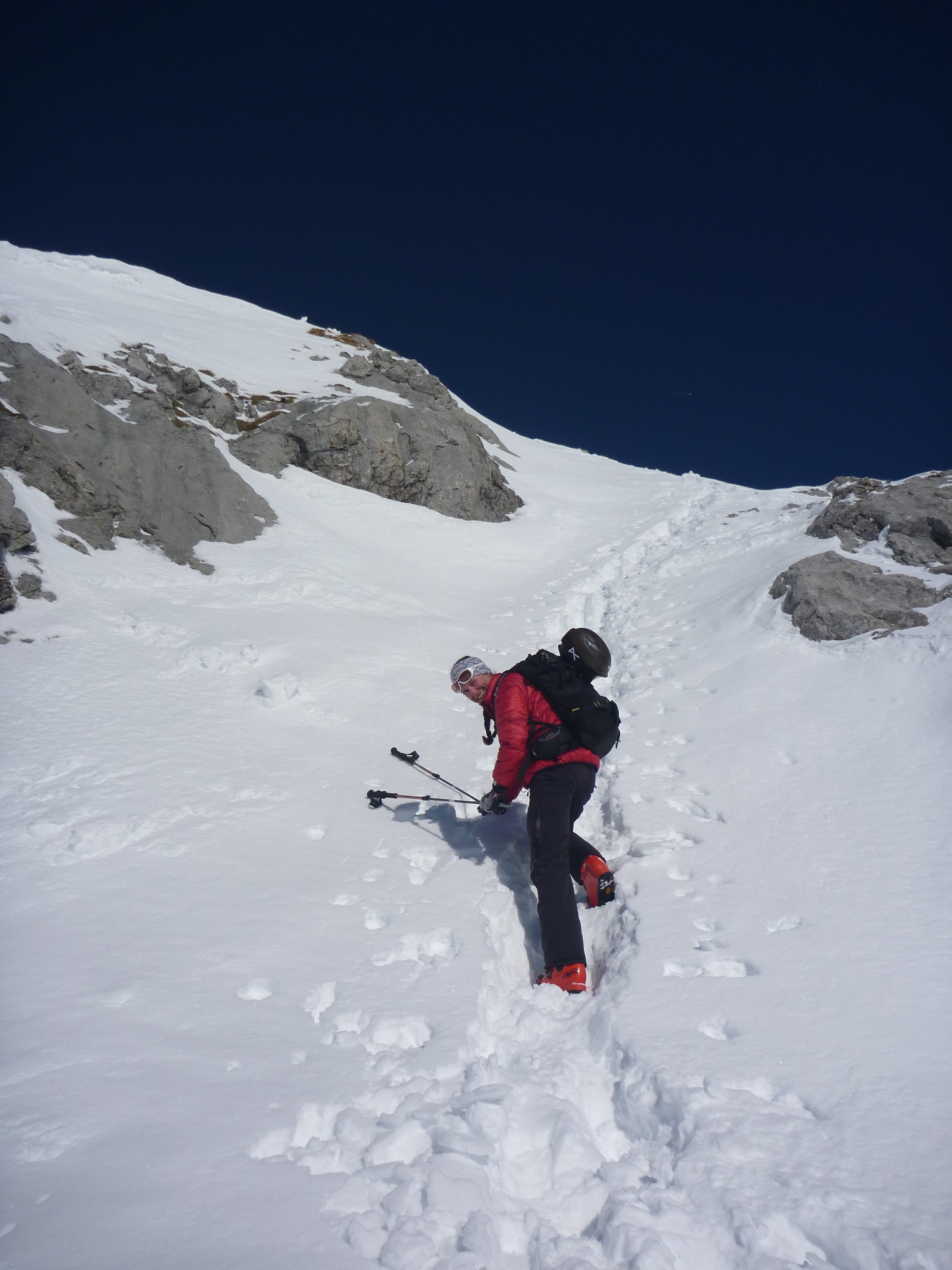 Von der Bergstation der Steinmähderbahn nach rechts in ein paar Treppenschritten hinauf zum Mohnenfluhsattel. Unterhalb der Mohnenfluh hoch queren und gleich wieder in Treppenschritten über einem Felsen traversieren bis unterhalb der Juppenspitze. Hier beginnt der Aufstieg auf die Juppenspitze. In direkter Linie bis in den Sattel zwischen Juppenspitze und Fernerspitze (2378 m). Vom Sattel nach rechts hinauf auf die Juppenspitze. Der Anstieg wird gegen Ende sehr steil. Vor dem letzten Anstieg die Skier unten lassen. Beim Erreichen der Wächte ist Vorsicht geboten. Die Gegenseite fällt senkrecht ab. Abfahrt: Vom Gipfel der Juppenspitze zurück zum Sattel und weiter zur Querspur. Von hier weiter nach links halten bis sich die weiten leicht geneigten Hänge des Fürmeslemähder sich öffnen. Über kupiertes Gelände hinab bis man beinahe den Talboden erreicht. Nun nach links halten bis zur Talstation des Auenfeld-Liftes in Schröcken. Hier kann eine Einzelfahrt gelöst werden, um dann übers Karhorn nach Lech zurück zu kehren. Optional kann man auch über den Winterwanderweg in ca. 30 Minuten nach Lech zurück laufen.