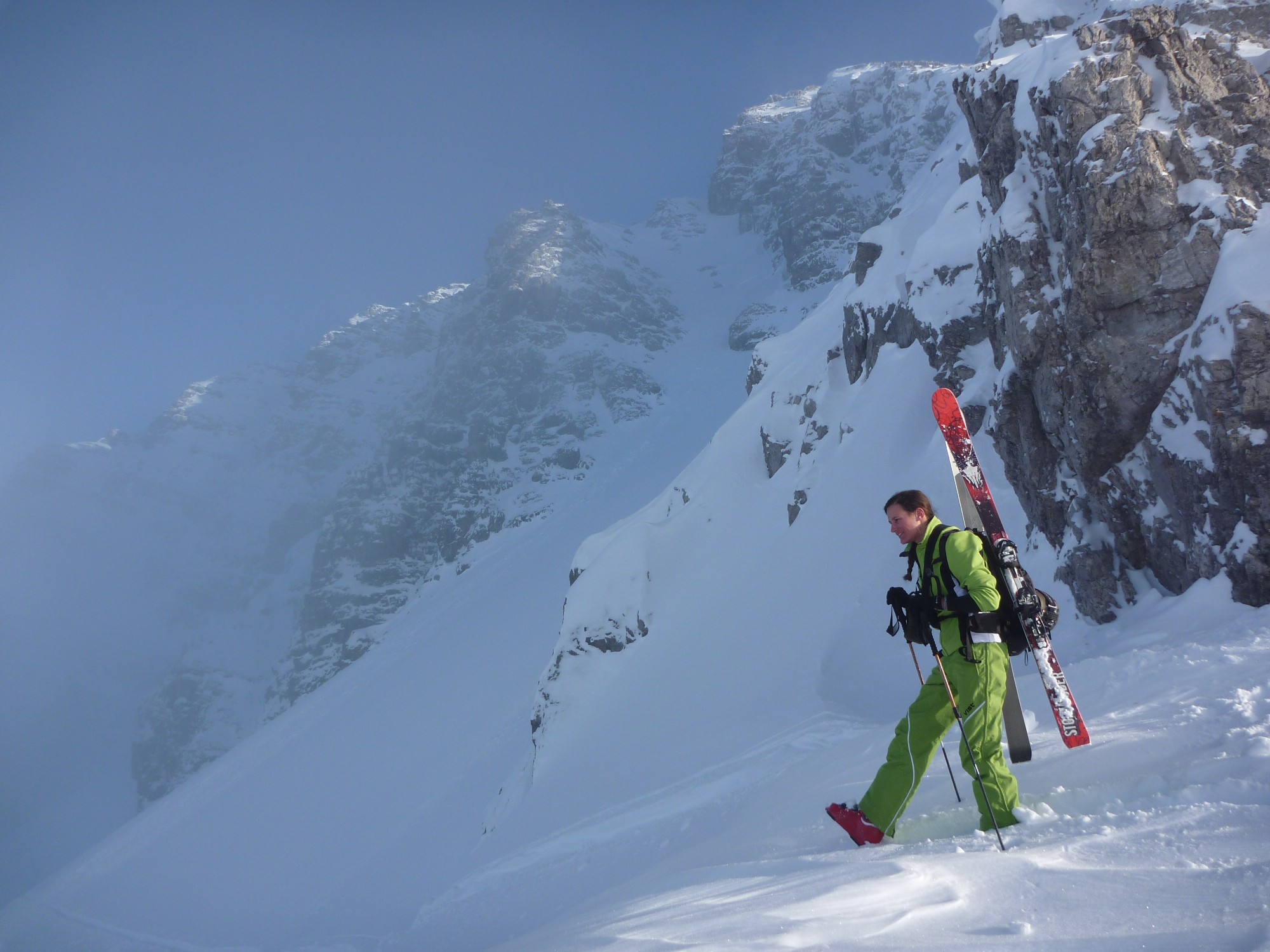 Die Freerideabfahrt vom Wöster ist die klassische Feierabendtour für die Skilehrer in Lech. Anschließend gibt es ein Bier und einen Leberkässemmel in der Metzgerei Hagen.