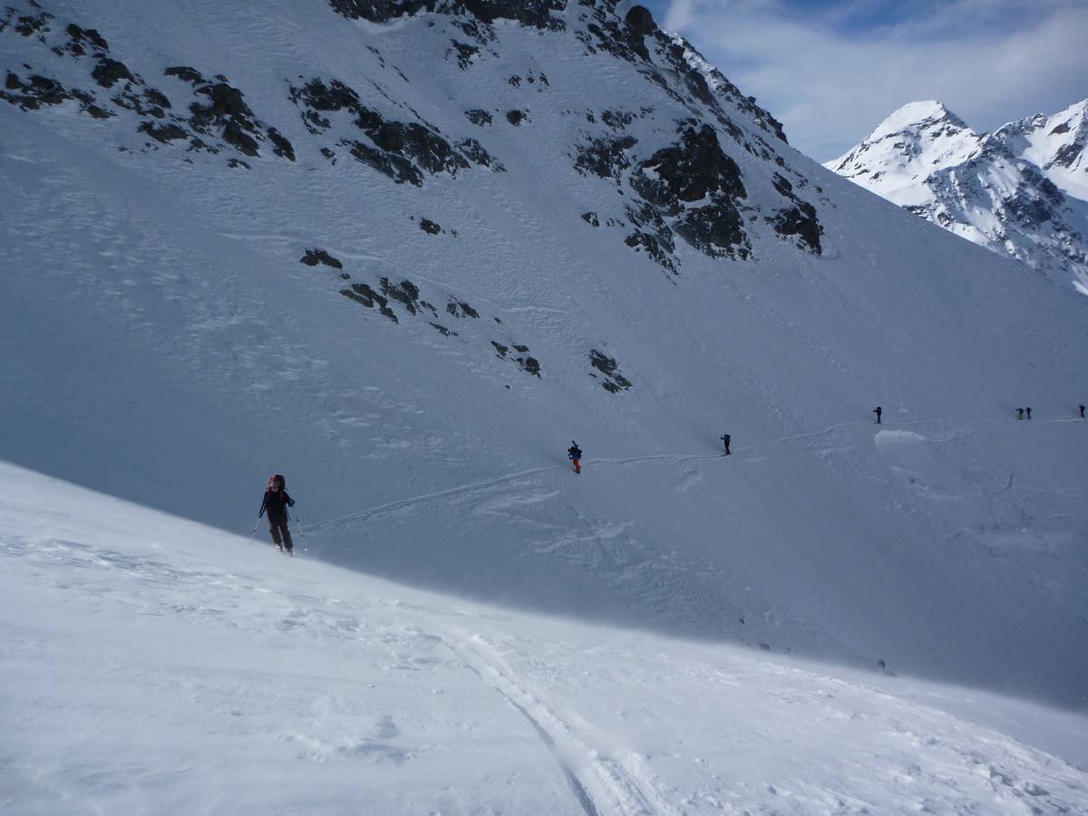 Über den herrlichen Südwesthang etwas rechts haltend bis zum Kartellsee. Hier kann über die Staumauer abgefahren werden bis zum Weg der weiter zur Rossfallalpe führt. Etwa 300 m nach der Rossfallalpe führt ein Weg rechts in einem kurzen Gegenanstieg hoch bis zur Maasbahn.