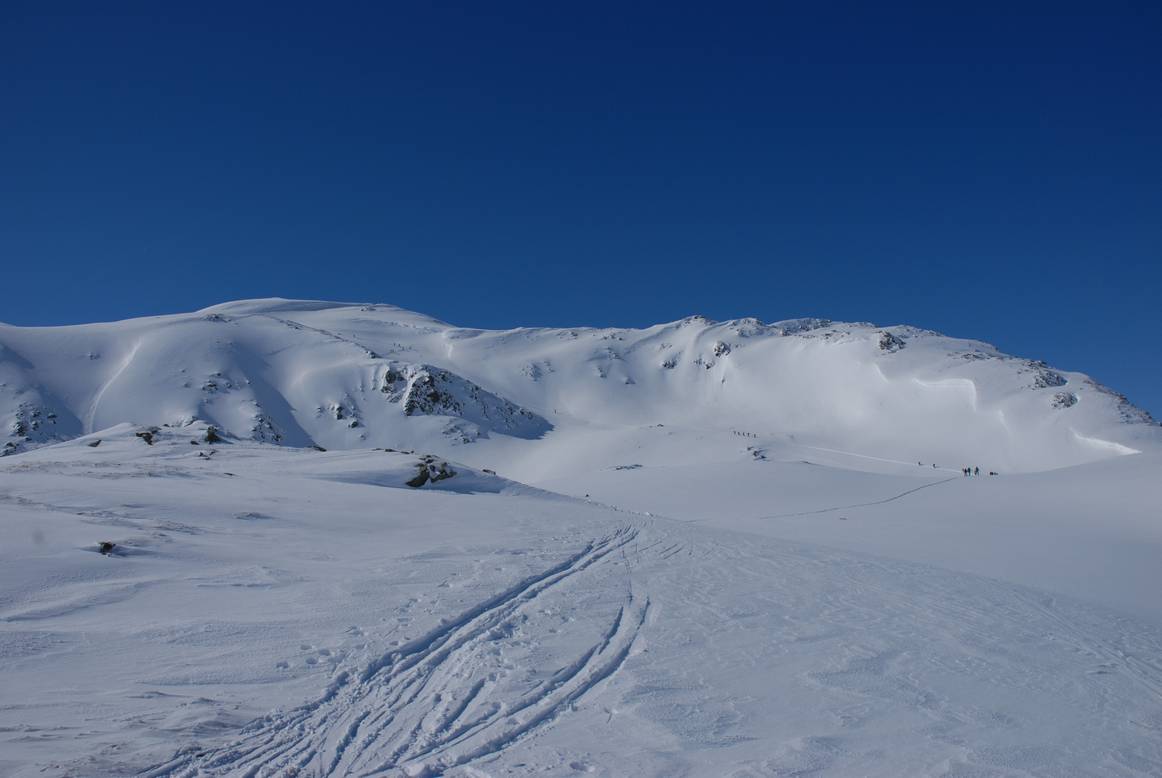 Ski down the Kaltenberg until you reach a prominent tower where you turn left and cross some steep terrain on the left side. Always keep to the left while you get across rocky terrain until you reach the vast western slopes of the Bettlerkars (see the picture above).