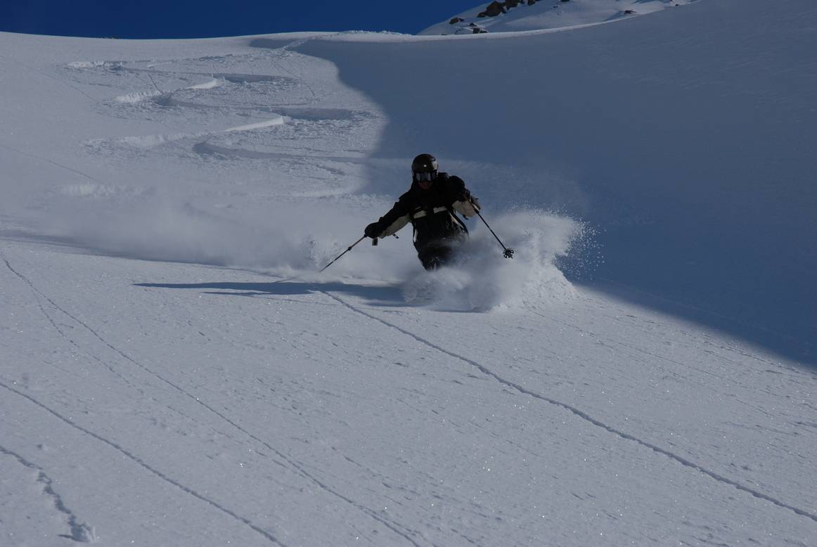 From the mountain station Sonnleitenlift am Albonagrat you go over a flat plateau in direction of the Maroikopf. It takes approximately 20 to 30 minutes to reach the Maroikopf summit. From here you already enjoy the first downhill run over the wide and not too steep slopes of the Kaltenberg. In the last part of the descent keep close to the right until you reach the bottom of the valley (hinteres Maroital). Here it’s time to put on the skins. Start going upwards to the left side over a short slope. Always keep the Kaltenberg in sight while you enter the valley. Go in towards the Kaltenberg crossing over a steep scarp until you reach a flat terrain. Now continue to the right over terraced ground to the Kaltenbergsee (See; German word for lake) then over the steep Kaltenberggletscher (Gletscher; German word for glacier) until you get to the ski storage, placed on the right side below the summit. You can reach the summit by easily climbing up to it. Its south face is somewhat exposed.