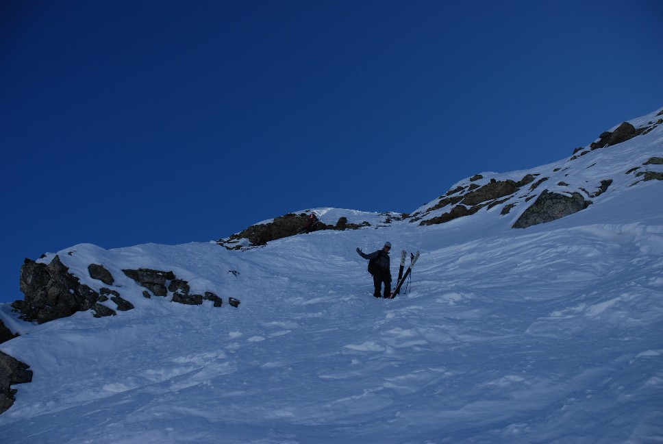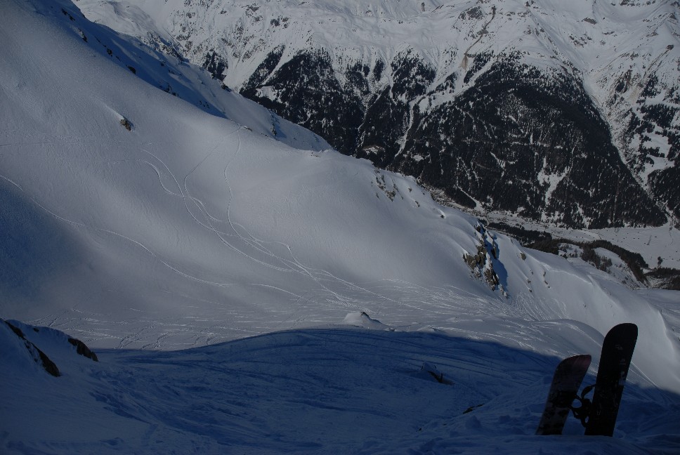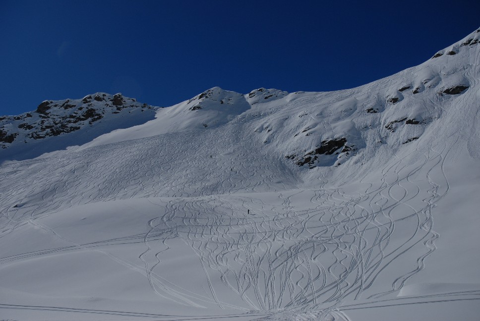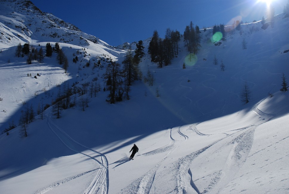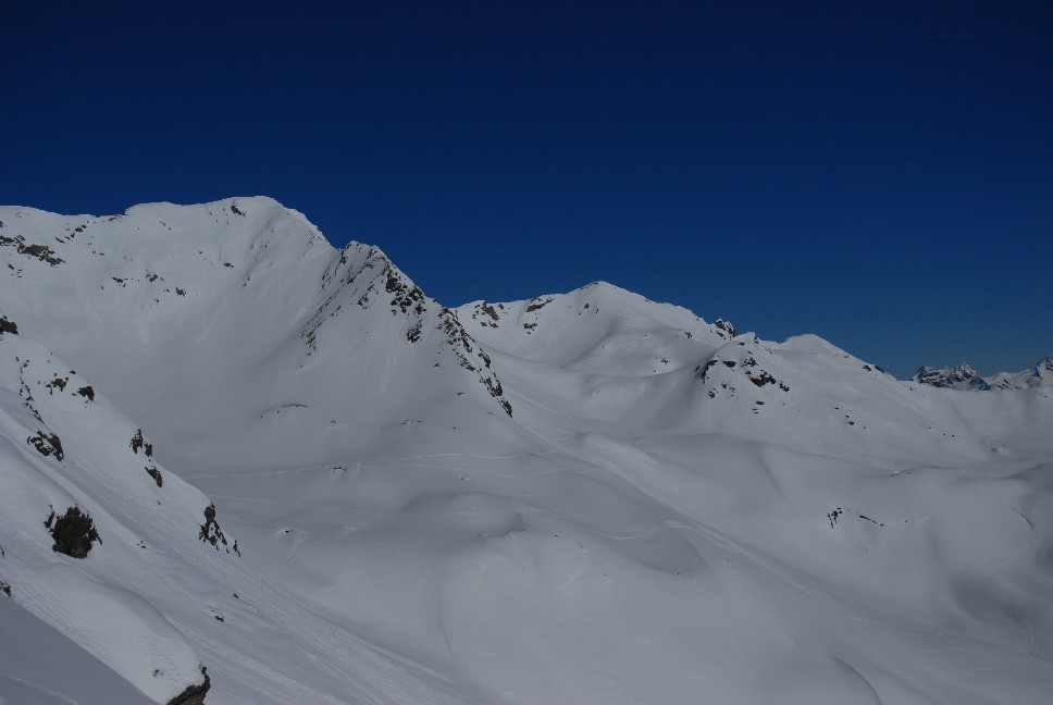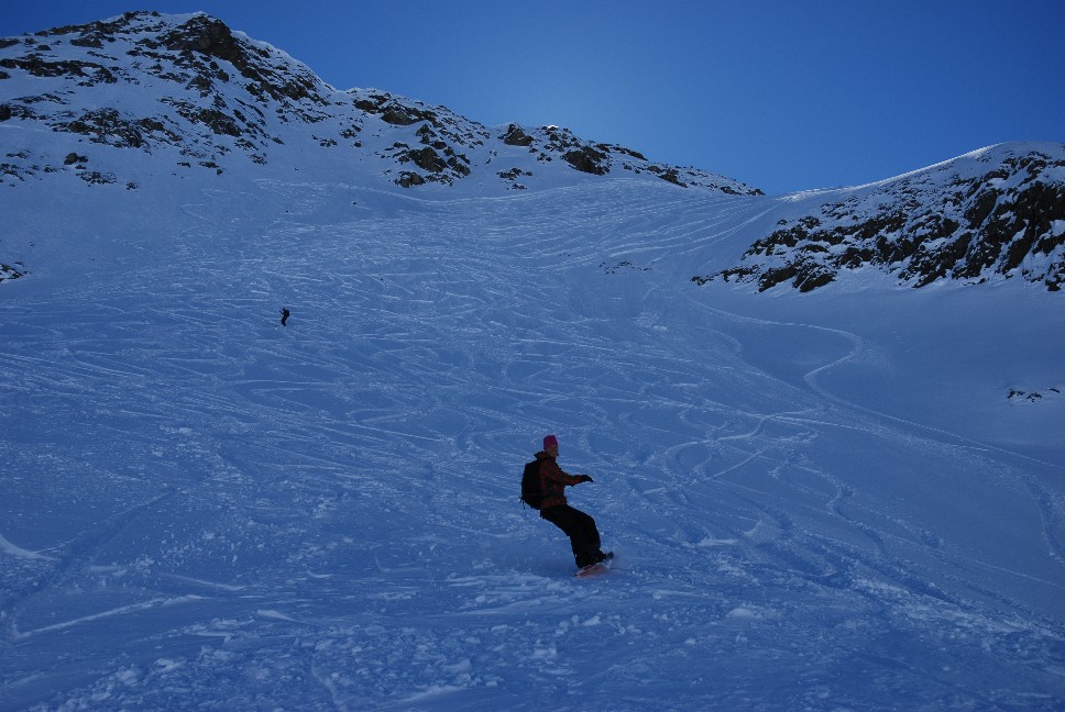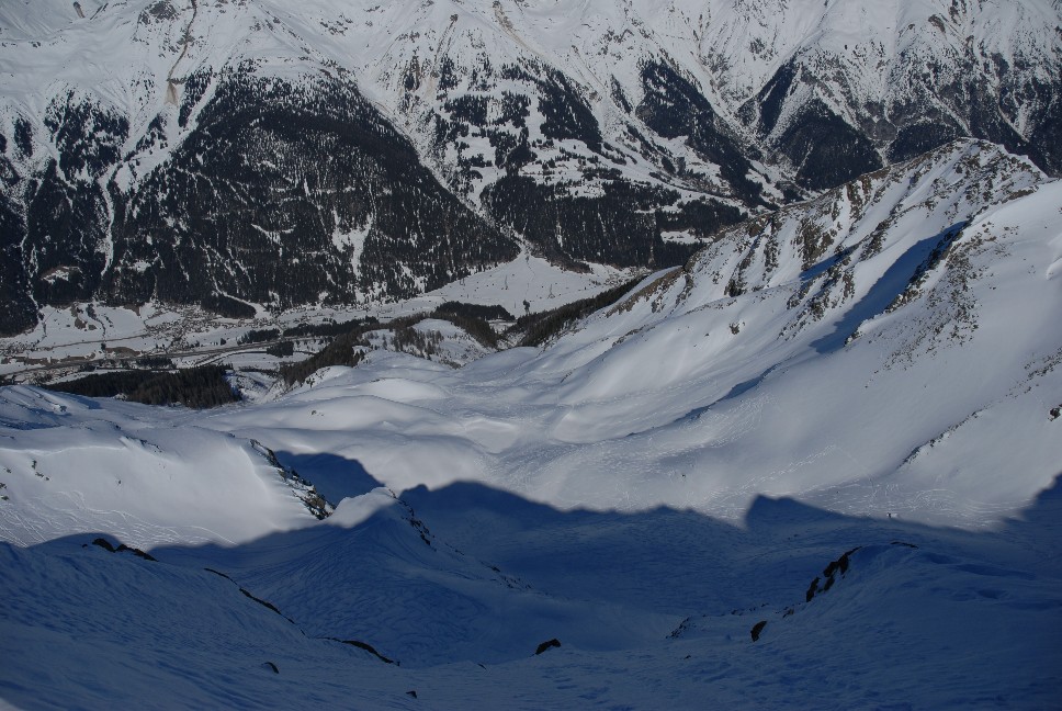 1. Abfahrt ca. 250 Hm norseitig hinunter ins Hintere Rendl; 2. Abfahrt ca. 100 Hm ostseitig Richtung Malfontal; 3. Abfahrt ca. 150 Hm nordostseitig und ca. 1400 Hm meist norseitig von der Gamskarspitze hinunter nach Grand bei St. Jakob ergibt Gesamt etwa 1900 Hm Abfahrt