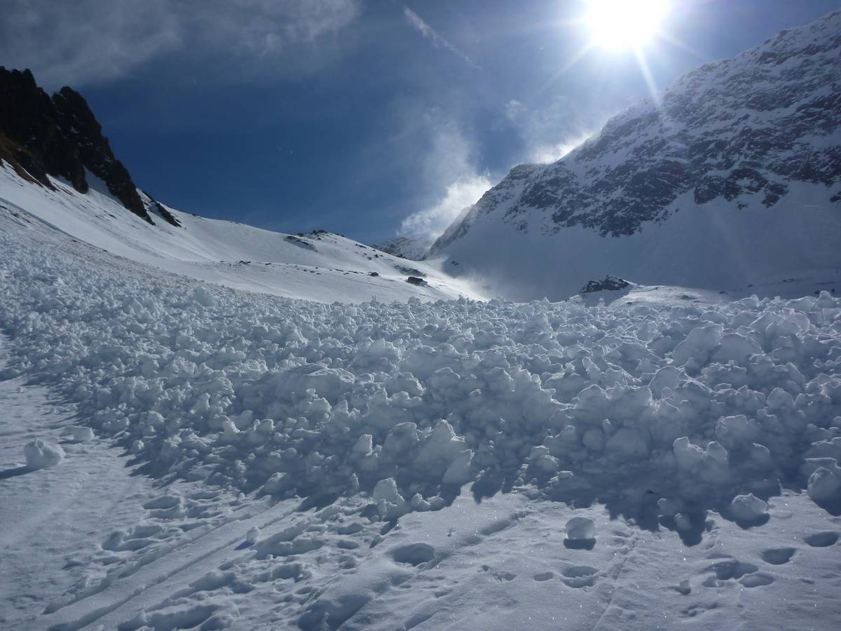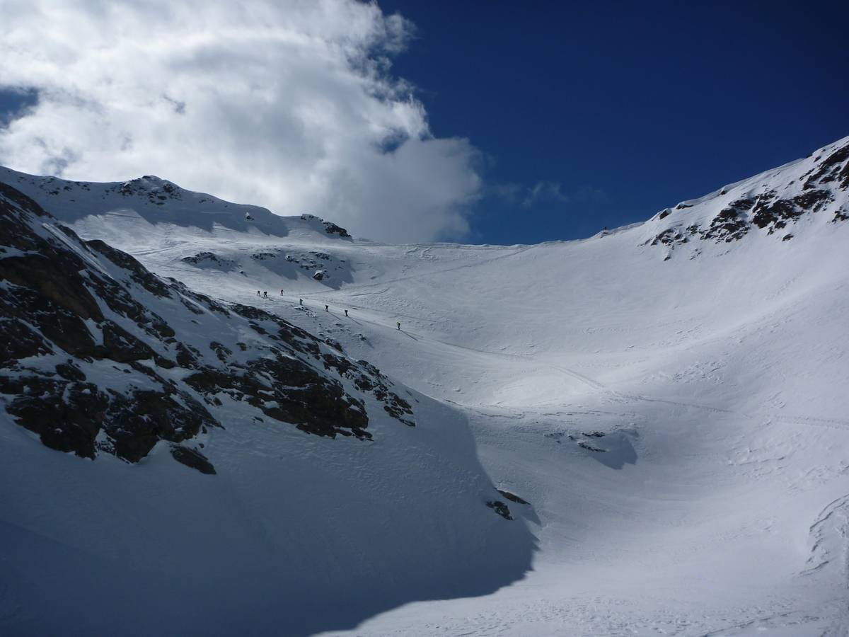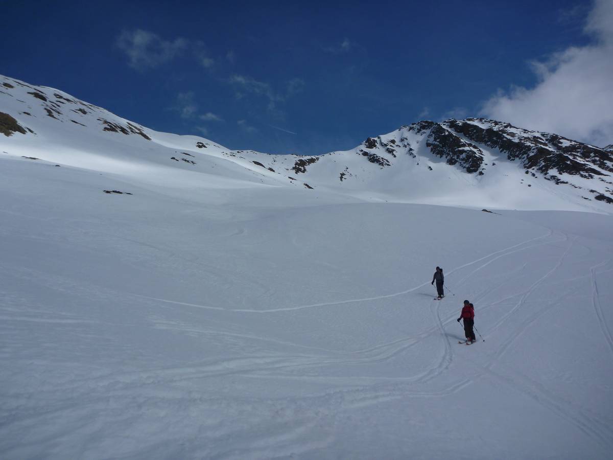 Über den herrlichen Südwesthang etwas rechts haltend bis zum Kartellsee. Hier kann über die Staumauer abgefahren werden bis zum Weg der weiter zur Rossfallalpe führt. Etwa 300 m nach der Rossfallalpe führt ein Weg rechts in einem kurzen Gegenanstieg hoch bis zur Maasbahn.
