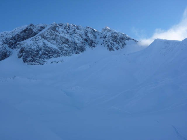 Die Freerideabfahrt vom Knödelkopf ist eine Skivariante mit kurzem Aufstieg, die nicht schon am ersten Neuschneetag völlig verfahren ist.