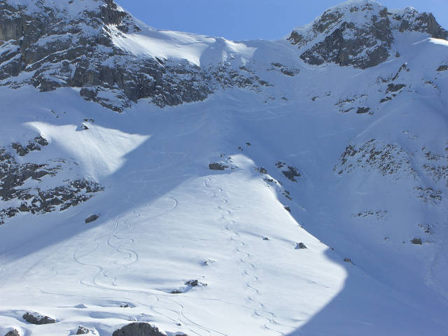 B2 ist eine Freerideabfahrt für Freerider die sicher am Ski stehen - denn wer fällt, fällt weit. Nur bei sehr viel Schnee überhaupt fahrbar.