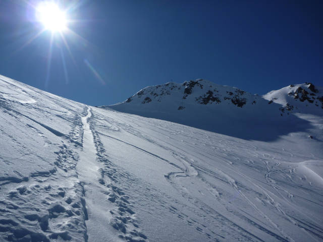 Der Nordhang der östlichen Eisentalerspitze mit etwa 1500 Hm Abfahrt zählt zu den schönsten Abfahrten im gesamten Arlberggebiet. Es gibt verschiedene Möglichkeiten, um in den Genuss dieses grandiosen Hanges zu kommen.