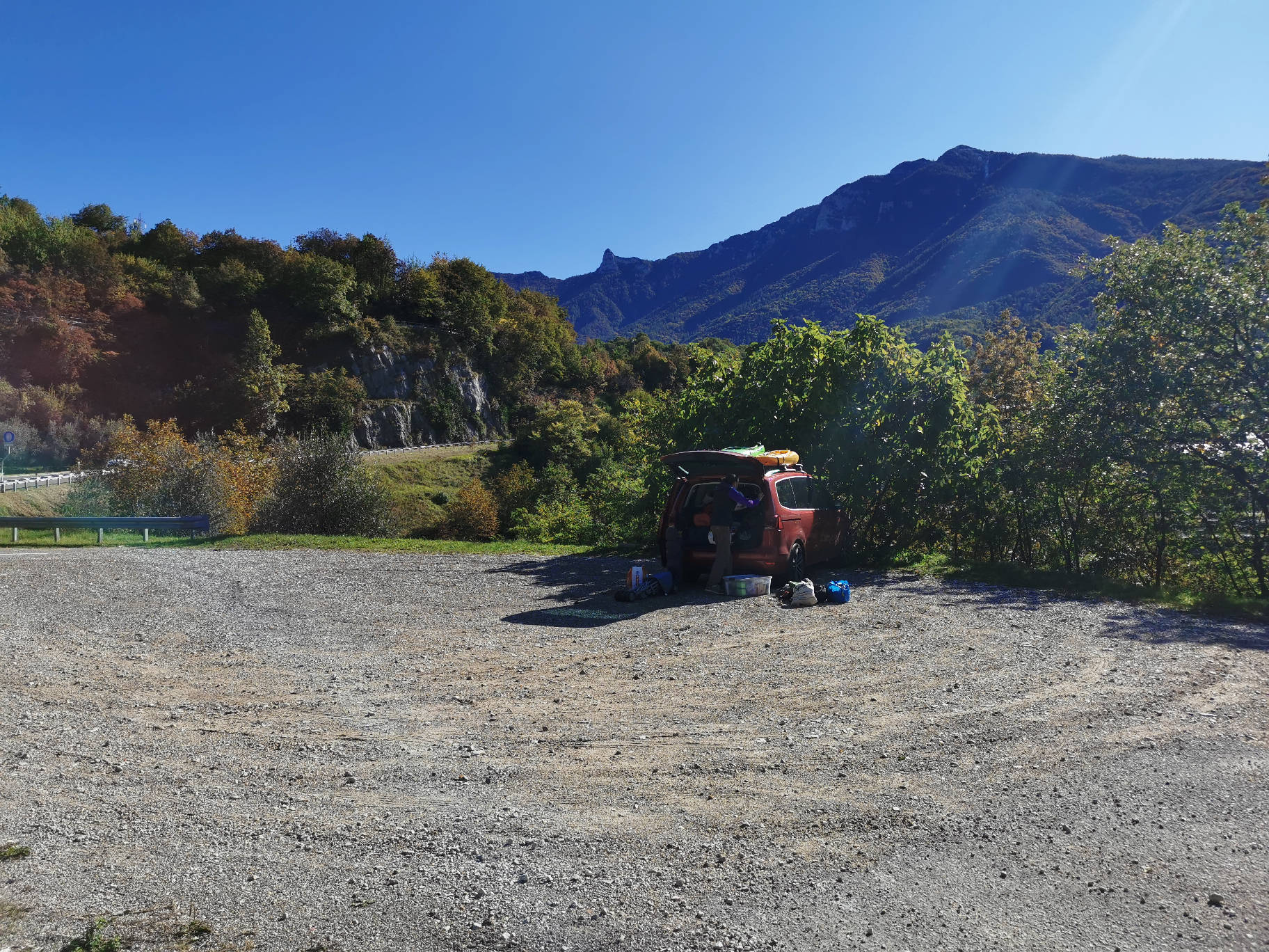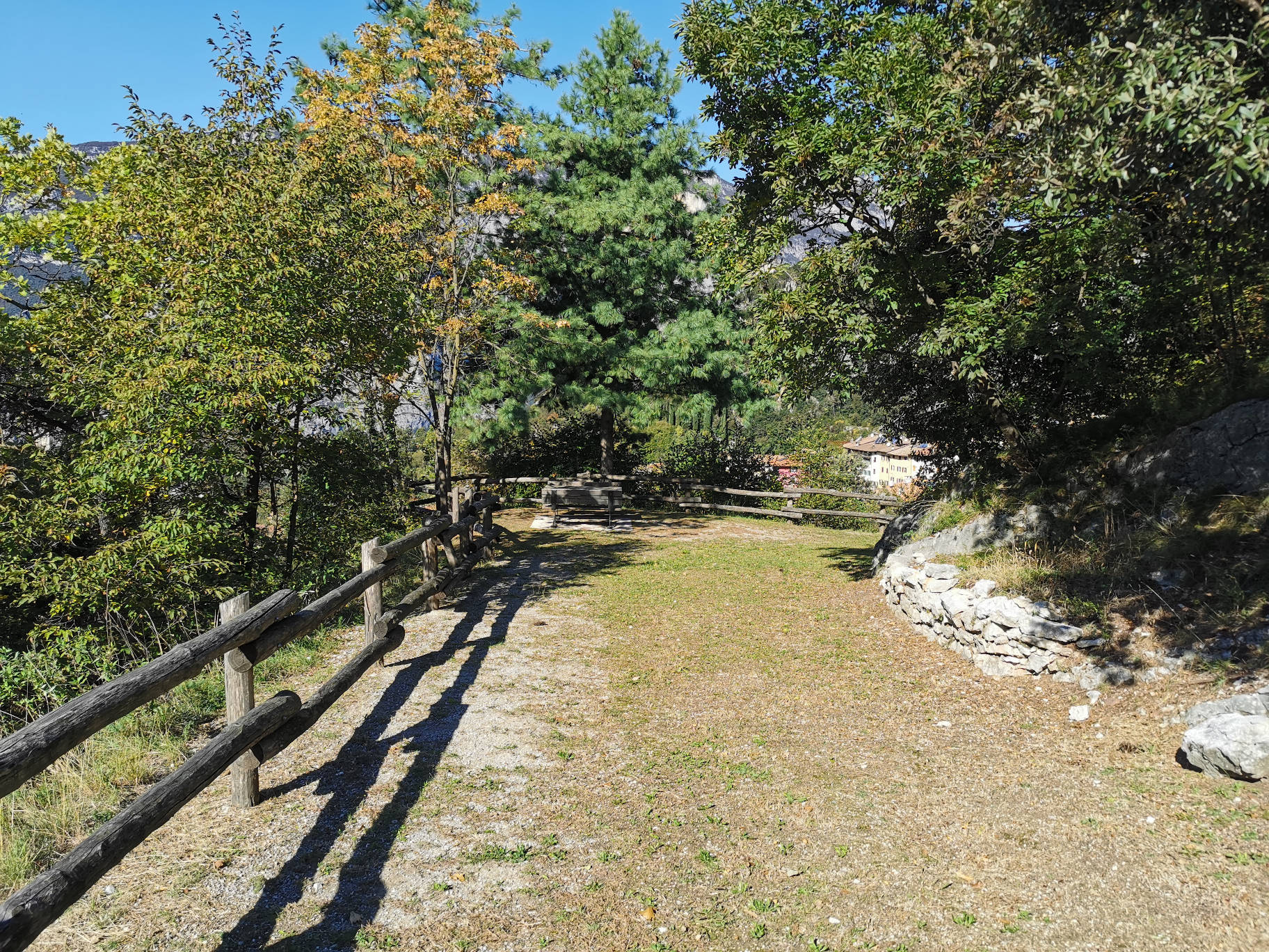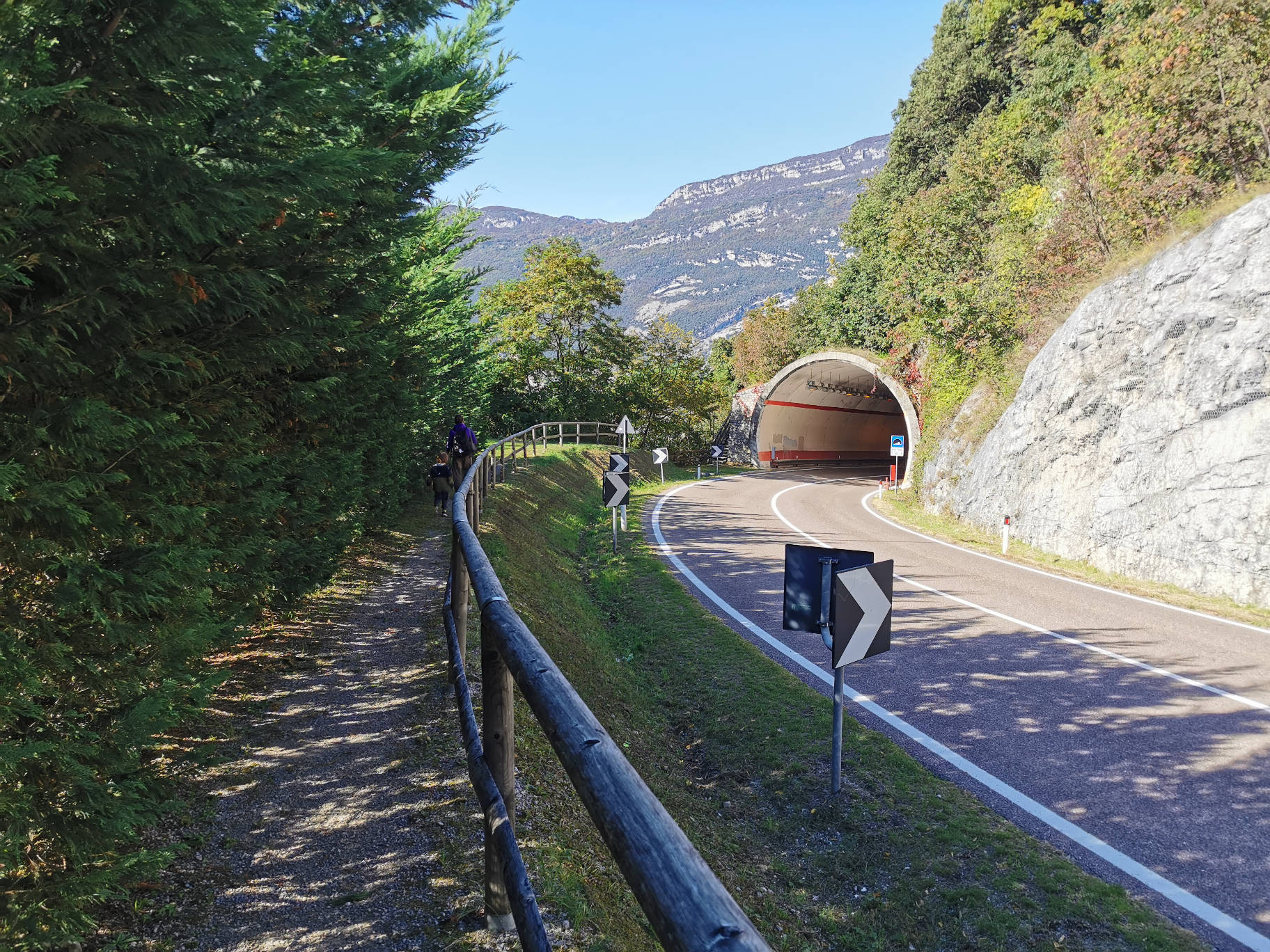 Erreichbar zu Fuß vom Parkplatz an der Strada Provinciale 84 des Cavedine-Tals, 200 m nach dem Wohngebiet von Drena. Kehren Sie auf dem parallel zur Straße verlaufenden Weg in Richtung Ort zurück und nehmen Sie die Treppe, die zum Aussichtspunkt außerhalb des Tunnels führt.