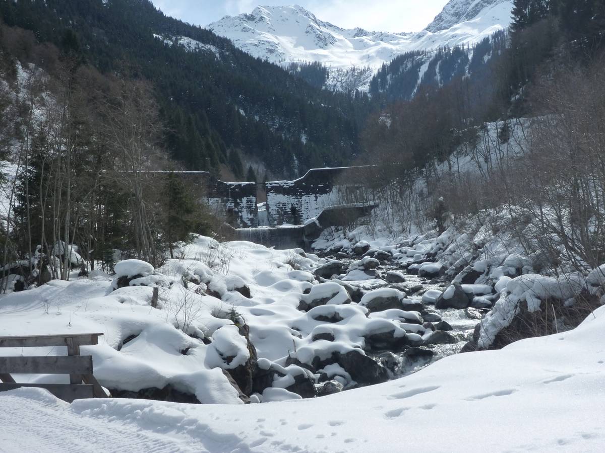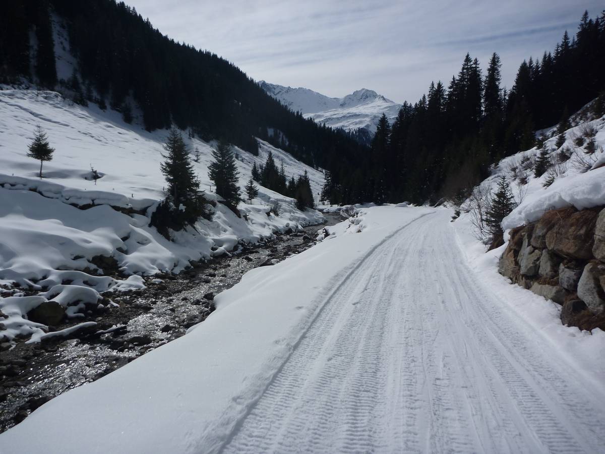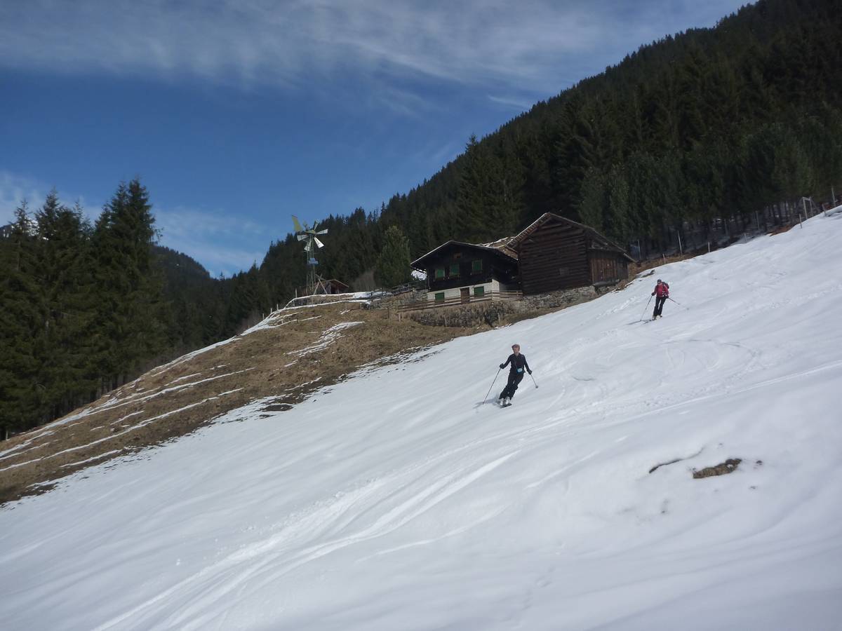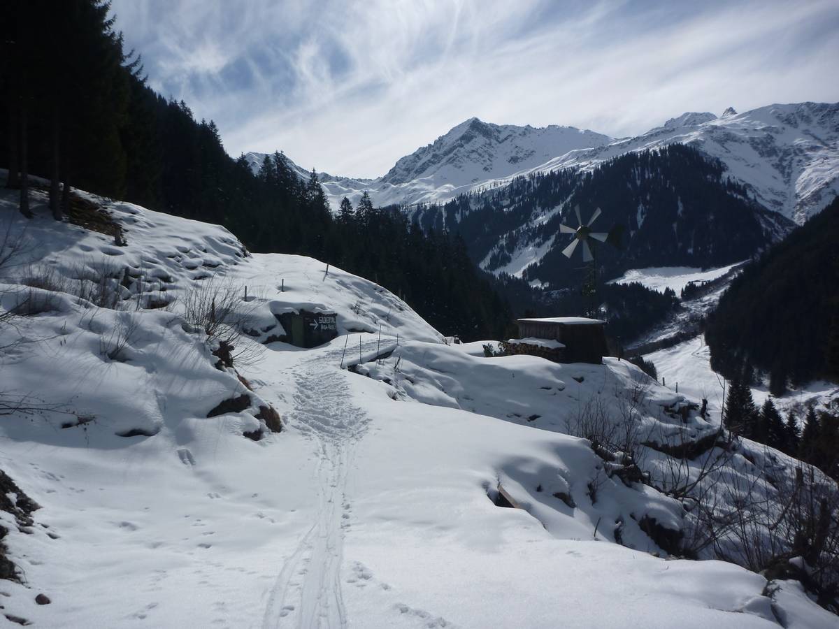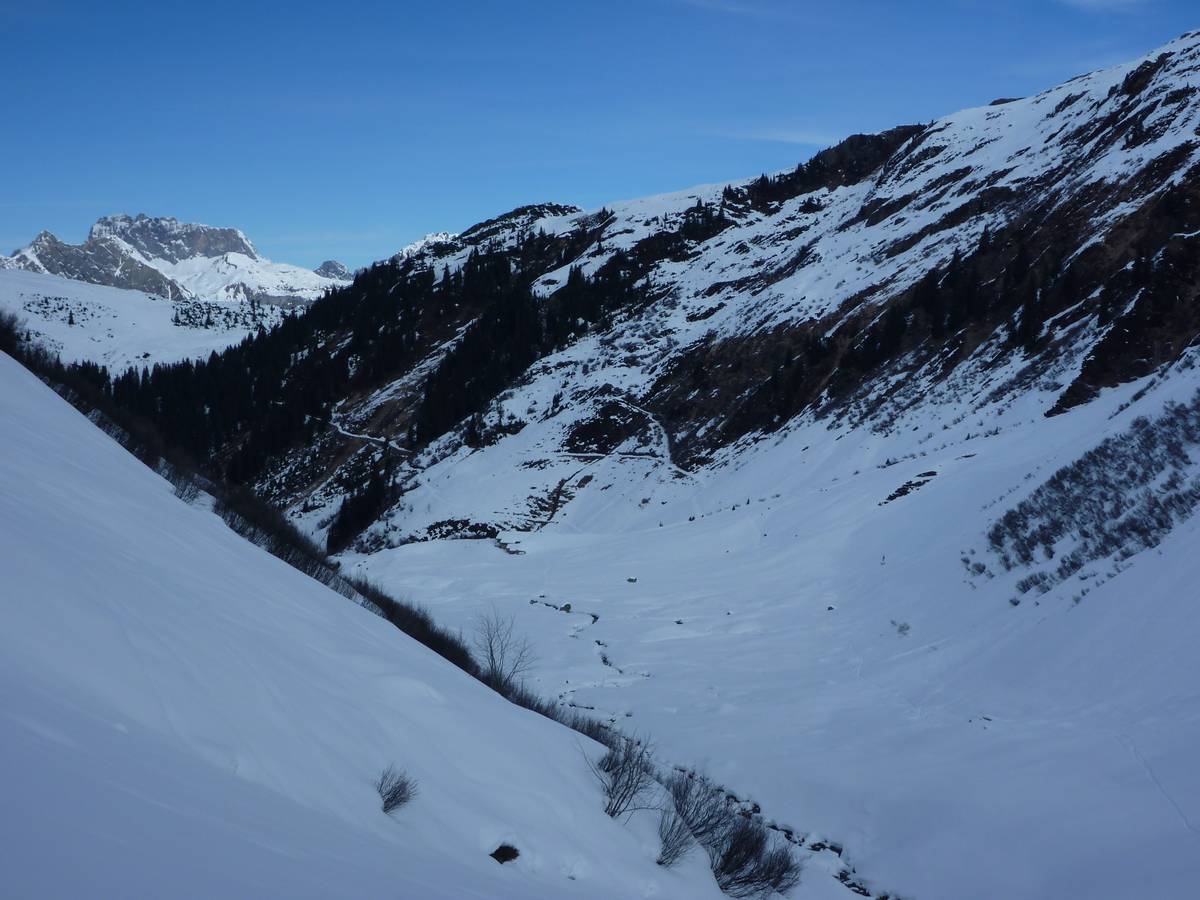 Nach einer tiefen Rinne etwas oberhalb eines markanten Felsen in den Nordwesthang einfahren. Über leicht coupiertes Gelände hinunter und immer etwas links halten. Etwa bei der Baumgrenze erreicht man eine Jagdhütte. Dem Forstweg folgen bis hinunter ins Wasserstubental. Dem Fluss entlang talauswärts. Nach einem kurzen Gegenanstieg (ca. 100 m) weiter dem Forstweg entlang. Beim Hasahüsli links weg hinunter zum Fluß und weiter bis zur Gemeinde Silbertal. Mit der Kristbergbahn hoch. Beim Ausstieg des ersten Schlepplift etwa 50 m nach links und dem Wegweiser Forstweg Dalaas folgen. Unten erreicht man die Skipiste eines Schleppliftes. Bei der Talstation des Schleppliftes befindet sich die Bushaltestelle.
