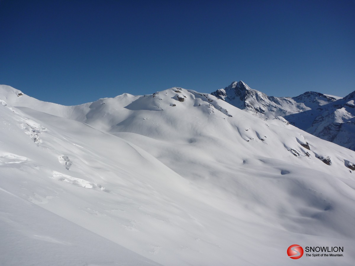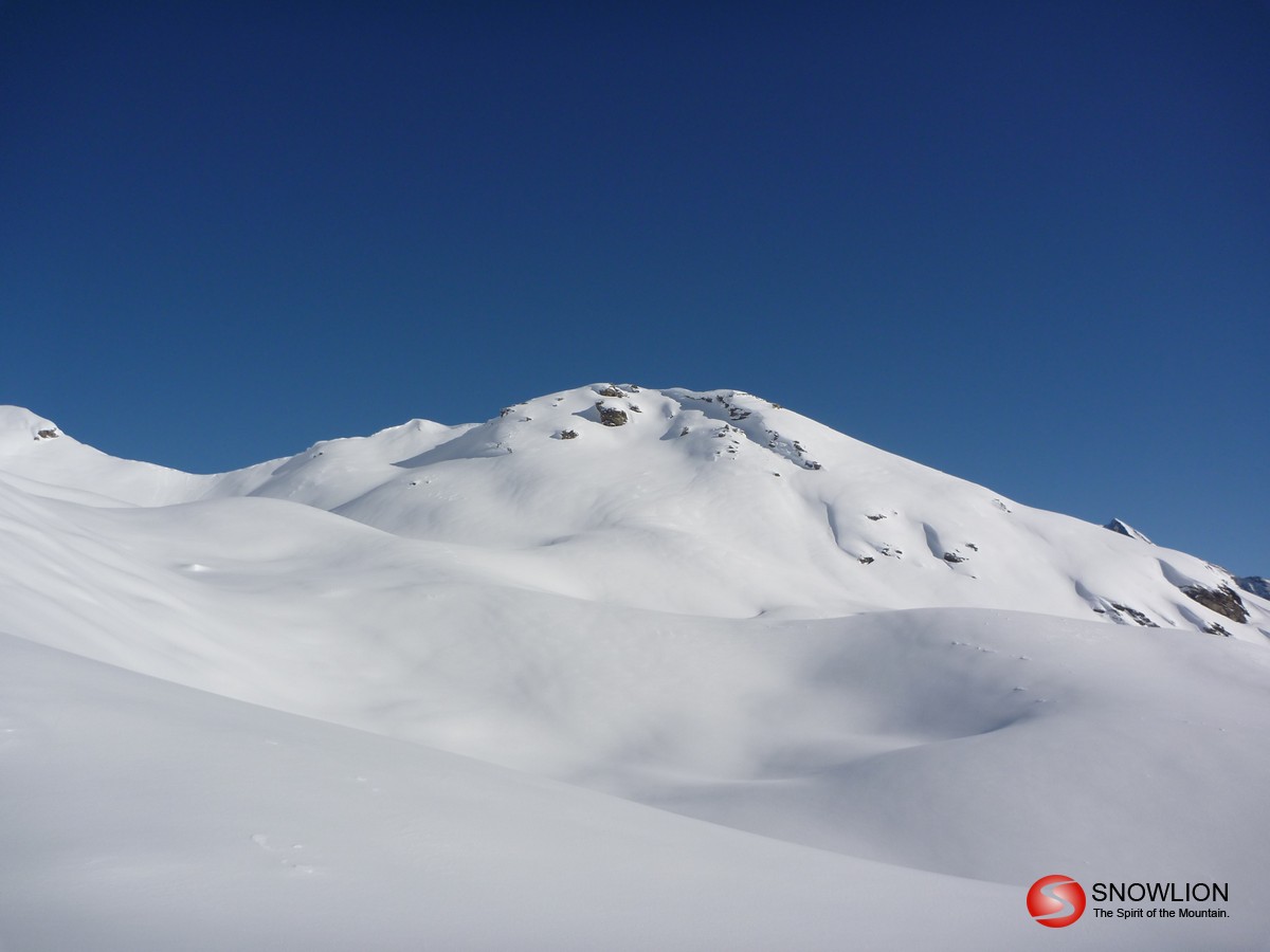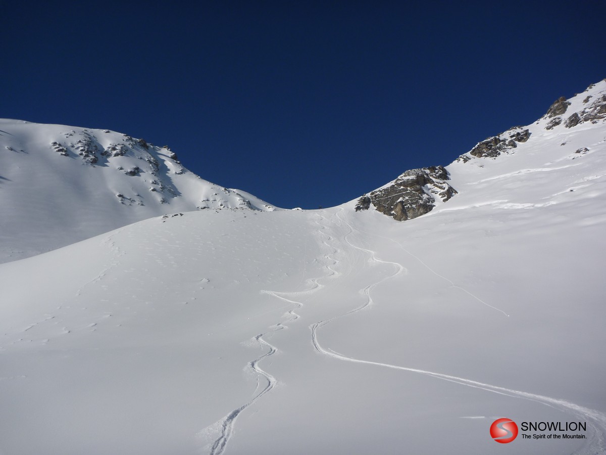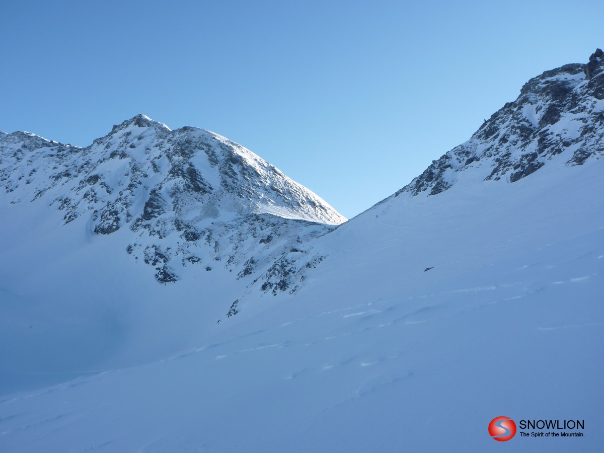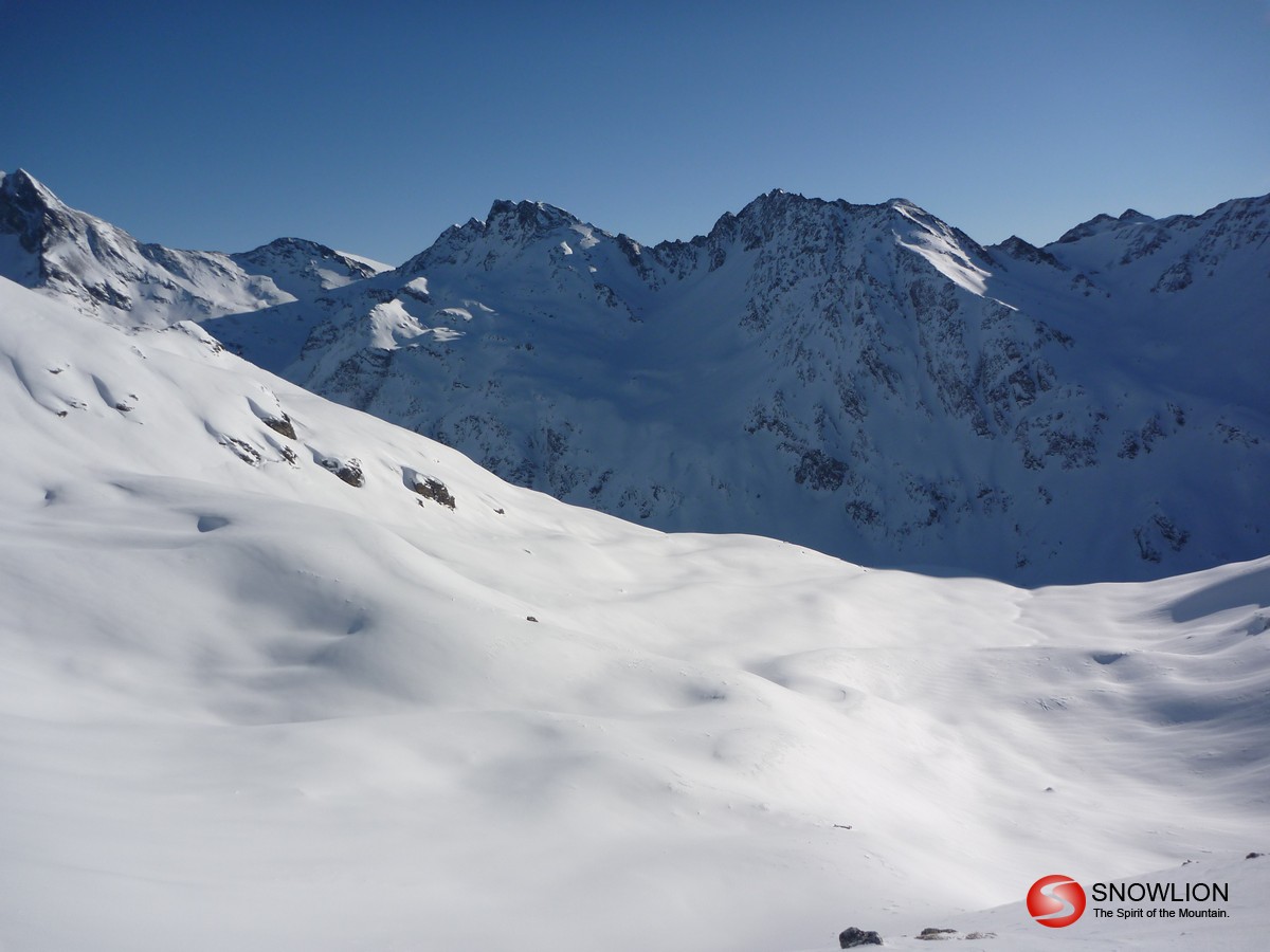 Über die Wächte hinab eröffnen sich die weiten Hänge des Malfontales. Zu Beginn noch recht flach kommt am Ende noch ein recht steiler Hang. Hier besser links halten. Die mittleren Rinnen sind sehr steil. Unten bei der Brücke auf die rechte Bachseite wechseln und dann dem Talboden entlang bis man einen Forstweg erreicht. Am Ende des Forstweges über eine Wiese bis zur Strasse. Kurz nach links Richtung Aktivzentrum Pettneu. Hier erreicht man die Bushaltestelle. Zurück nach St. Anton sind es ca. 5 km.