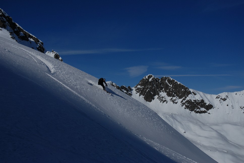 Erste Abfahrt etwa 300 Hm südöstlich ins Eisental (Isetäli); Zweite Abfahrt ca. 1500 Hm vorwiegend nord bzw. nordost bis nach Langen am Arlberg